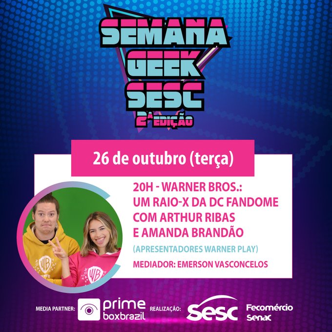 A #SemanaGeek tá demais! Os apresentadores da #WornerPlay Arthur Ribas e Amanda Brandão são os convidados do segundo. Anota na agenda e te programa: é dia 26/10, às 20h, lá no nosso Youtube. #VempraSemanaGeek #SescGeek #Geek #VemproSesc #Cosplay #CulturaGeek #SescRS