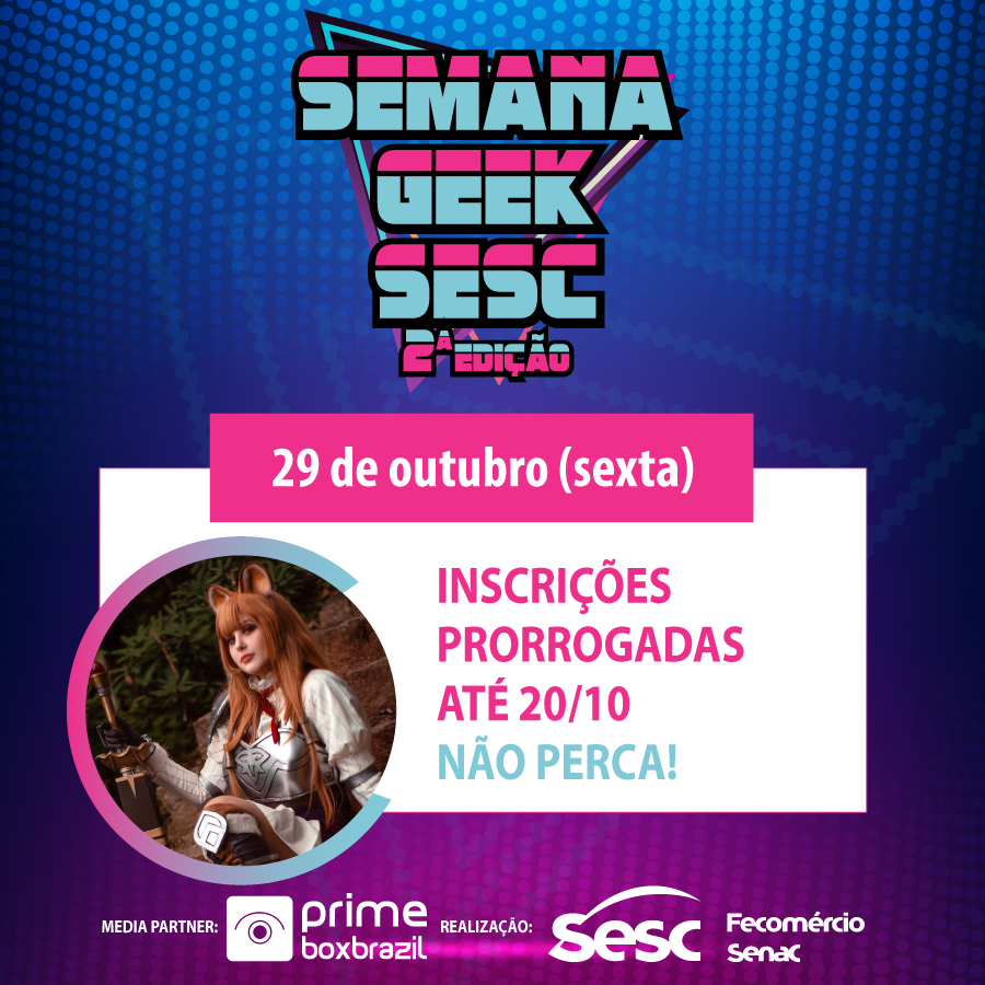 Hey, cosplayers! O Concurso Cosplay da #SemanaGeekSesc teve inscrições prorrogadas até 20/10! Inscreva-se no site sesc-rs.com.br/geek :) #VempraSemanaGeek #SescGeek #Geek #VemproSesc #Cosplay #CulturaGeek #SescRS #FecomércioRS