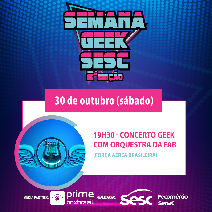 Para encerrar a #SemanaGeekSesc a Força Aérea Brasileira conduz o concerto de trilhas sonoras de filmes que marcaram a cultura pop. É dia 30/10, às 19h30, com transmissão ao vivo pelo Youtube. #VempraSemanaGeek #SescGeek #Geek #VemproSesc #Cosplay #CulturaGeek #SescRS