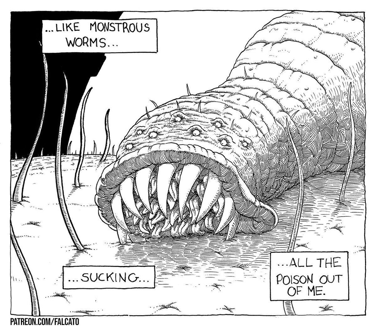 Still going. Here's 13- #DUNE Yuri really hates #leeches. He thinks they suck. I'm doing all #inktober2020 live, daily. (links in bio) #falcato #inktober #penandink #leech #comics #scifi #macro #sciencefiction #illustration #prehistoric #shaman #sickness #cure #handdrawn