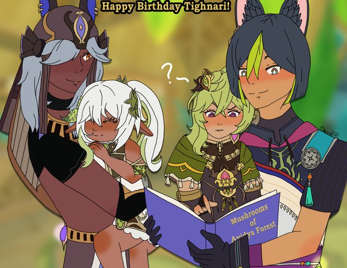 Happy birthday to my favorite desert dog!!! Best wishes to the bestest boy and his found family! Tags: #Genshinlmpact #genshinimpactfanart #tighnari #cyno #cynonari #nahida #collei #tighnarigenshinimpact #cynogenshinimpact #nahidagenshinimpact #colleigenshinimpact