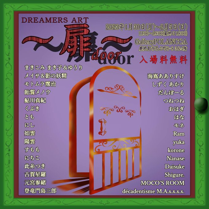 【お知らせ】 鹿児島市名山町のギャラリー ポランカの絵画展「扉展」に参加いたします! 都合のつく方はぜひご来場くださいませ😊✨ 会場:Gallery POLANCCA 鹿児島市名山町8-8 3F&4F 会期:2023/1/30(月)~2/5(日) 時間:11時から19時(最終日18時まで) 入場:無料 #kagoshima_art #鹿児島 #DA扉