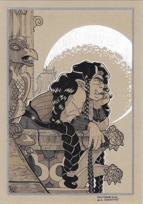 INKTOBER 01 Gargoyle Featuring my OC Odán, the female orc. She's not a common orc, as you'll find out by reading with attention the clues I'll give 😉 #inktober #inktober2022 #day1 #gargoyle #originalcharacter #odán #odanmrakkulak
