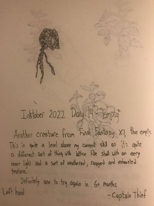 I had a few ideas for drawing Empty, but decided on a bit of a challenge. It definitely looks off, so I included the source picture from the ff wikia. Apologies for the herbs bleed through. #Inktober2022 #Day14 “Empty”