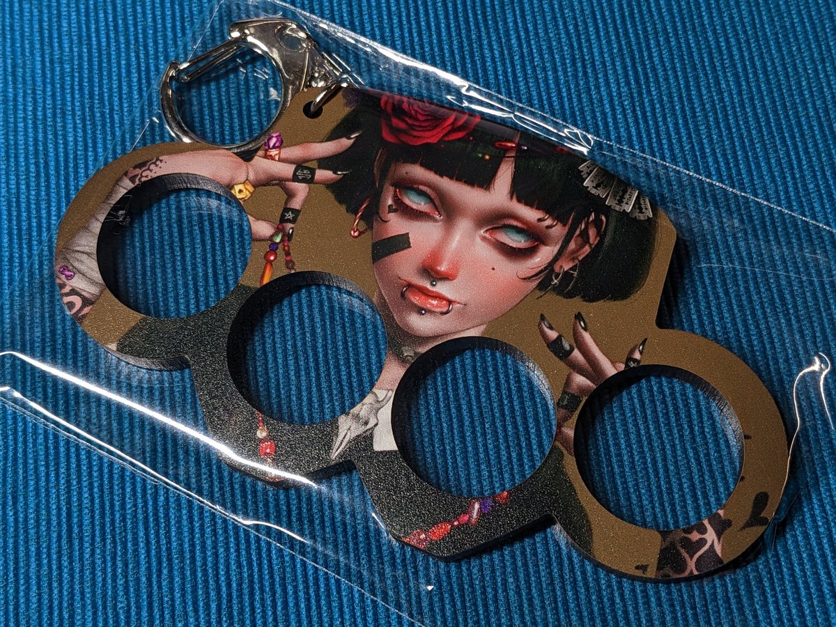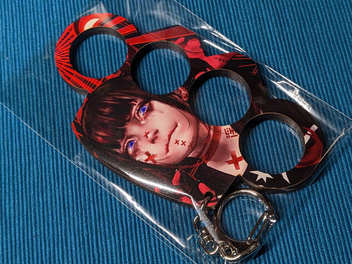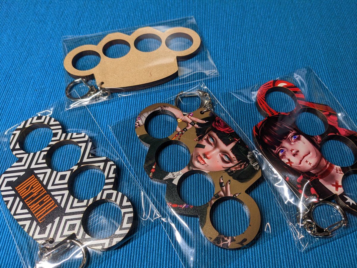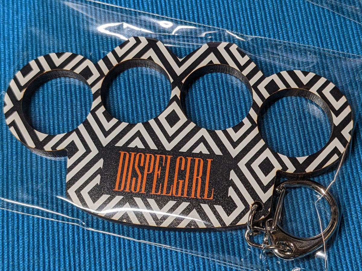 #DISPELGIRL メリケンサック・キーホルダー完成しました! デザインはA.ロゴ、B.DISPELGIRL、C.好きを殺すと嫌いが死ぬお呪い、の三種 材質はMDFとなっております。※裏面無塗装 こちらの商品はメリケンサック型の感染症対策・非接触キーホルダーです。武器としての使用はダメ絶対。 #SRBGENk