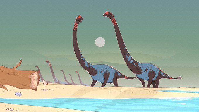 DINOVEMBER 🦕🦖 Day 5: On the sandy shores of a lake, two male Mamenchisaurus size each other up; ready to fight! Just like giraffes. A small hermit crab gets a front row seat; while the herd clears the arena. 🏞👊💥🦀 #ArtistOnTwitter #paleoart #dinosaurs #Dinovember2021