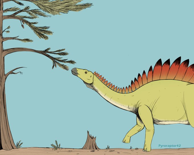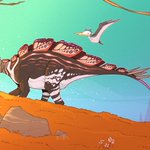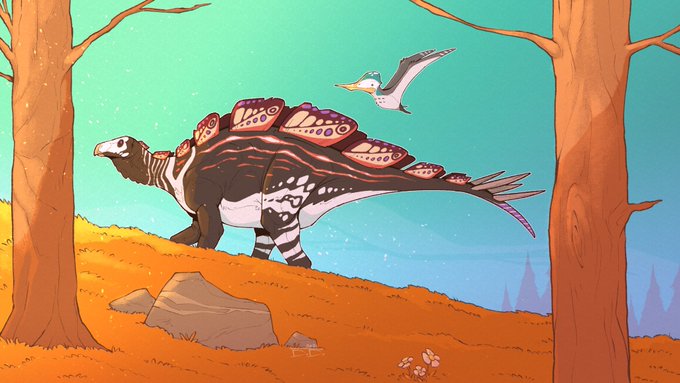 DINOVEMBER 🦕🦖 Day 6: A male Wuerhosaurus is walking up a ridge on a nice autumn day, along with a small female pterosaur known as Chaoyangopterus keeping him company 🍂🌳 *Colors based off of @Tytofi and @MoratoryTech ✨✨ #ArtistOnTwitter #paleoart #dinosaurs #Dinovember2021