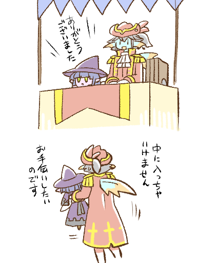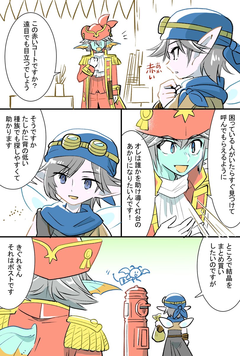 #DQ10マイキャラ交流作品投稿タグ バザー職員のカイトが働いているところに、お手伝いしたい不思議えるこちゃんのルミティスさんと、意識高い系イケメン死霊探偵ギルテさんがお買い物にきた一幕を描かせてもらいました。ありがとうございました!