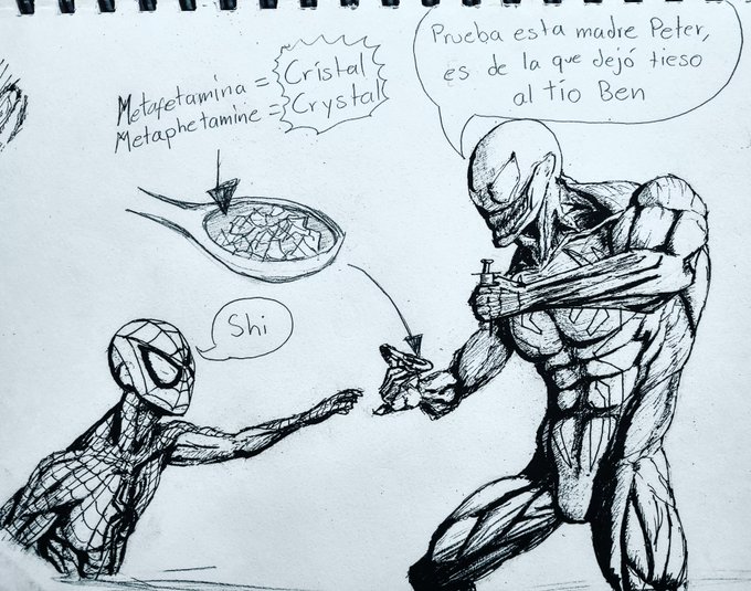 N: Day 1 - Crystal -V: try this shit Peter, (don't know how to translate this xd) -S: Yes Ñ: Día 1 - Cristal @inktober #inktober2021 #SpiderMan #Venom #DRUGS #cristal #Crystal #drawtober #draw #dibujo #Marvel