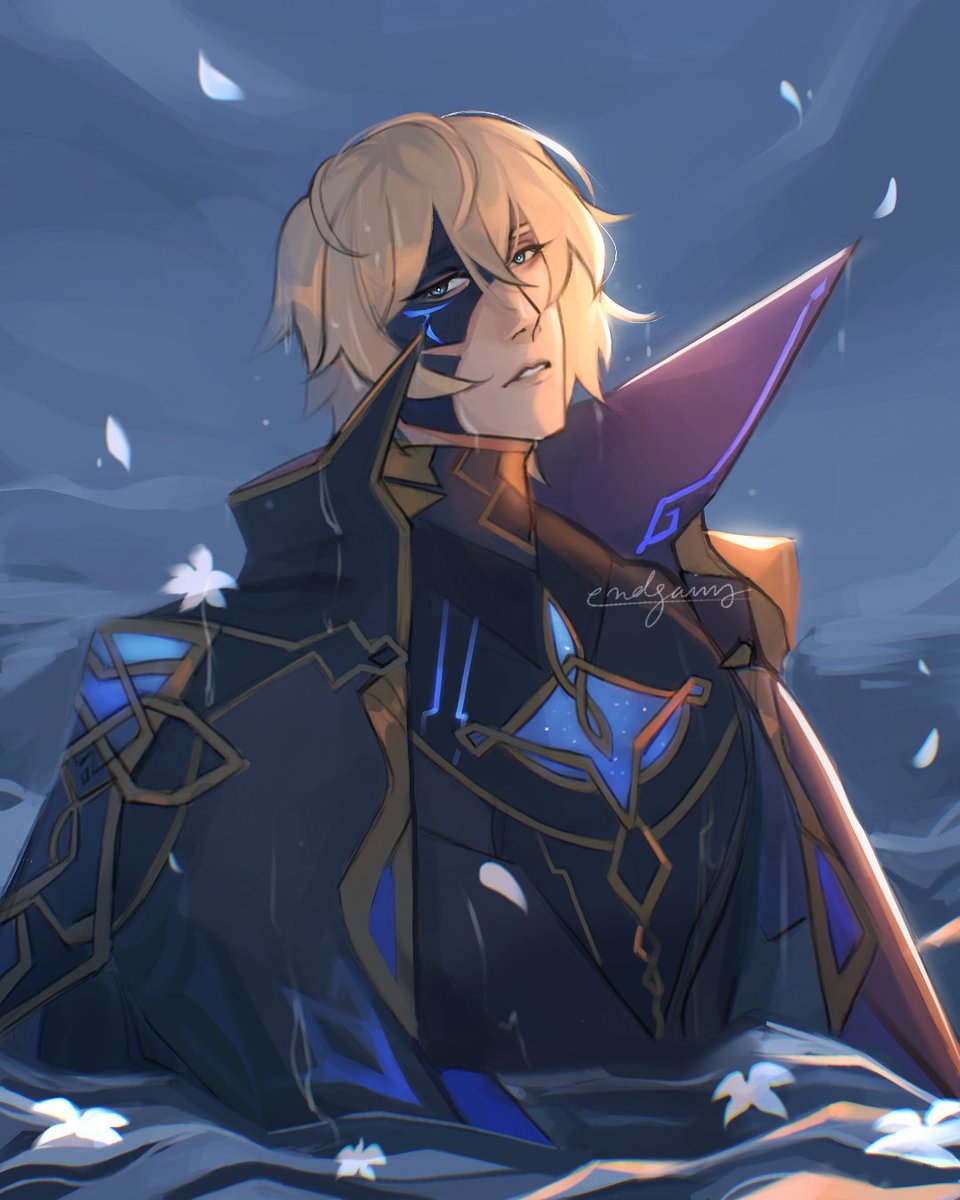 I've gotten really attached to adding water drops/ water aesthetics in my art. They make things so melancholy and dramatic. especially after dain's quest, melancholy and dramatic is just what we need #dainsleif #Genshinlmpact #genshinart #genshinimpactfanart #dain