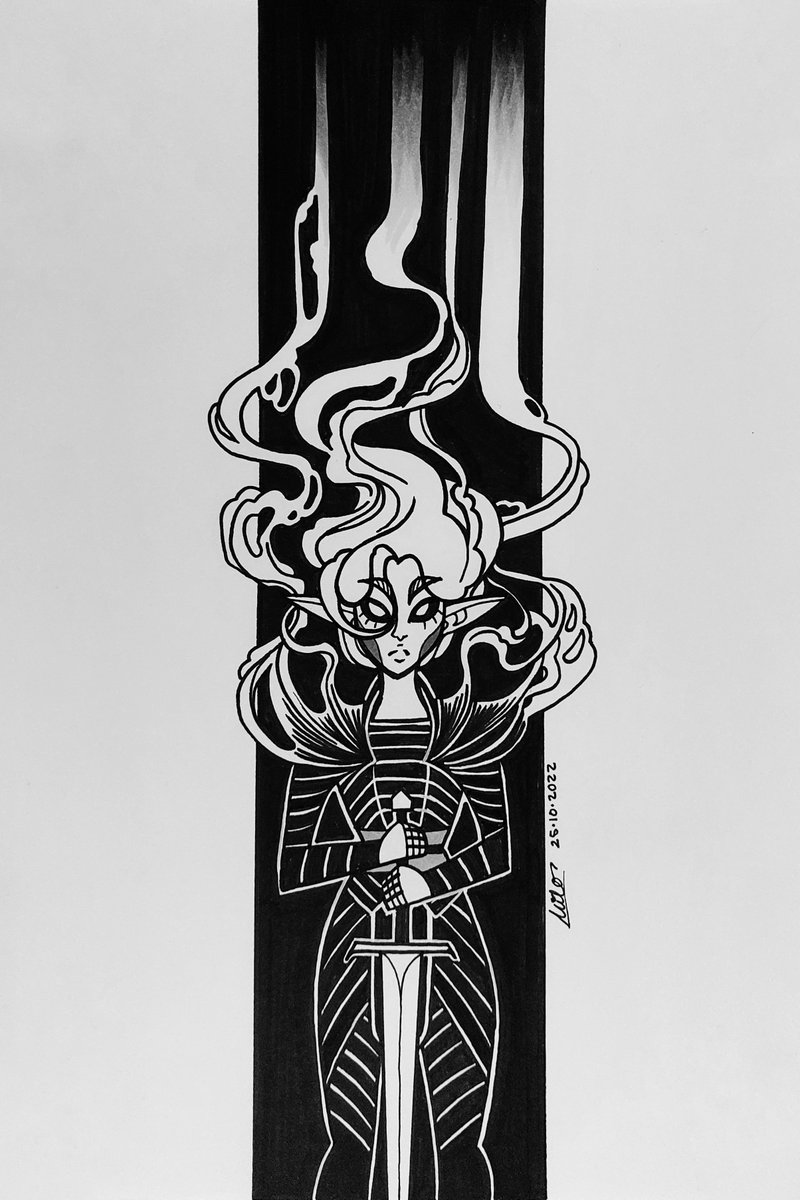 Gah the forever juggling act to keep up! Another combined prompt! Does anyone else remember the art released from World of Warcraft circus the early 2000s and how enamoured we all were by the dark elves? Just me? #darkknight #smoke #darkelf #monstergirlmonth #artober #inktober