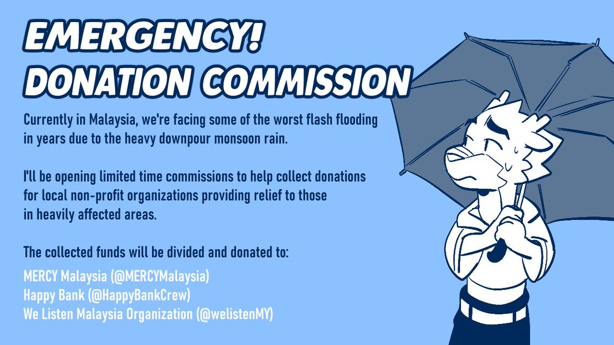 Hey guys, I'm opening #DaruratBanjir donation commissions to raise funds for local NGOs to help those in heavily affected areas. These will be closed once a certain quota is reached! 🔽Open the thread for google form link and more infos. RTs are appreciated! Makasih!🙏