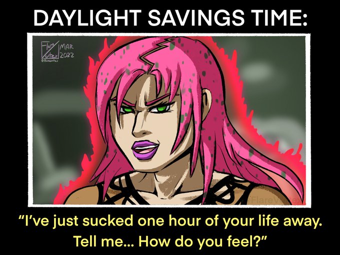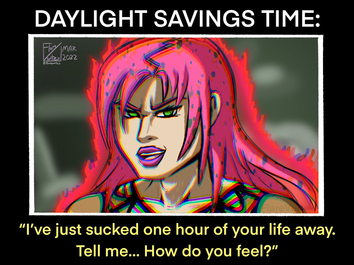 It’s that time of year again~ #jjba #jjbafanart #JoJo #JoJosBizarreAdventure #jojo_anime #anime #Diavolo #ventoaureo #fanart #meme #daylightsavingstime