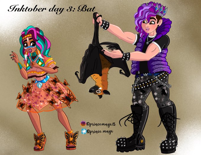 Inktober day 3: Bat Vanya Queen showing Evelyn Powhatan a flying fox, even though she has a phobia of almost anything flying. #inktober #inktober2022 #day3 #bat #sketch #drawing #illustration #procreate #disney #everafterhigh #descendants #princevanya