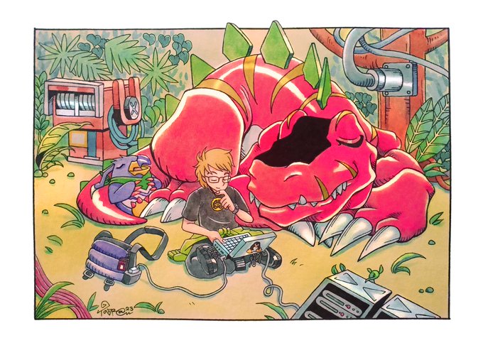 (>>OPEN COMMISSION_DM please!<<) 'An afternoon nap in Tropical Jungle' commission done! #デジモン #digimon #tyrannomon #Muchomon #digimonworld #taragraphika #commission #digimonfanart