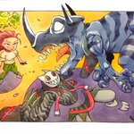 (>>OPEN COMMISSION_DM please!<<) @Ursidae89 Commissioned me a rampaging Greymon (Blue) getting surprised by her OC Digimon: Lurkmon! and her tamer Hayley as bait! #デジモン #digimon #lurkmon #hayley #originalcharacter #digimonworld #taragraphika #commission #digimonfanart #OC