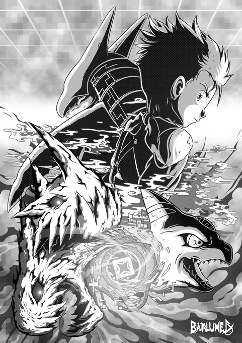Remake of an old drawing: "Legends". 🐳 Ryo Akiyama (秋山 遼) and Cyberdramon (サイバードラモン)! Feel free to sustain my future works/colored versions via Ko-fi: 🔗 ko-fi.com/barlume #デジモン #Digimon #DigitalMonster