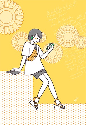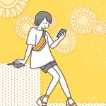 2023年カレンダーのための描き下ろし テーマは本と花 8月:向日葵 小さな向日葵が好きで、向日葵だけの花束を 作ってもらうのがスキ💗 #illust #Illustrator #イラスト #イラストレーション #デジタルイラスト #digitalillust #オンナノコ #カワイイ #レトロ #オシャレ #ファッション