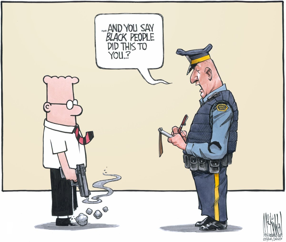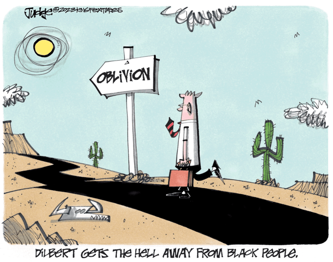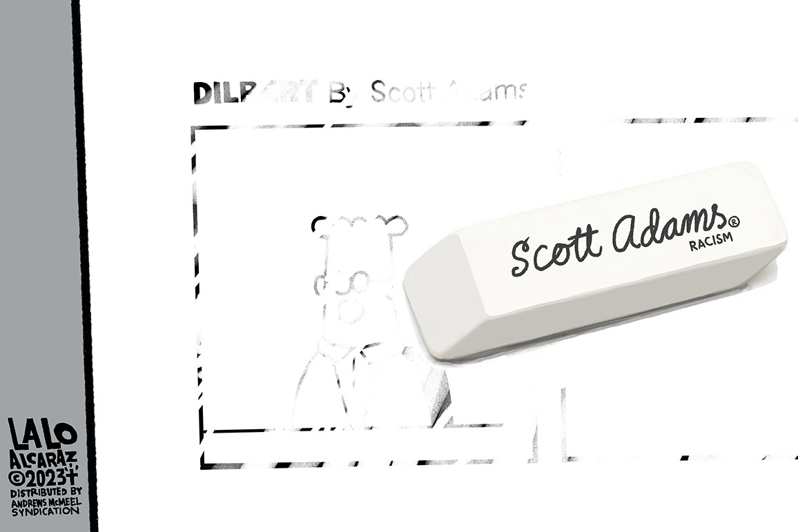 Scott Adams may not believe in Eracism, but he sure did erase his comic strip in newspapers everywhere because of his racist rants. Please share #laloalcaraz cartoons! #Dilbert #Racism