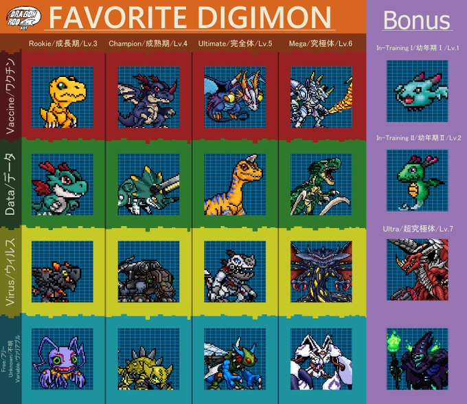 I believe this summarizes well my #Digimon tastes! Yeah, I like dinosaurs, dragons, and some underground weirdos XD Thanks @slamanthaplays for the amazing template! Was very fun ^^ . #pixelart #DigimonGhostGame #gameart #Fanart #vitalbracelet #dimcard #DigimonGhostGame #デジモン twitter.com/slamanthaplays…