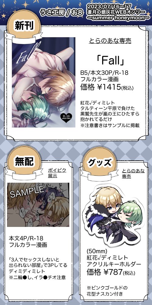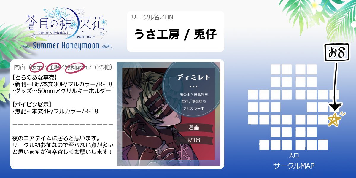 2023/7/16~17開催「蒼月の銀灰花 ~summer honeymoon~」にて、新刊ディミレト本とグッズと無配を出します 人見知りコミュ障おばけですが沢山お話できたら嬉しいです☺️ 【pixiv】 pixiv.net/artworks/10993… 【くるっぷ】 crepu.net/post/2433754 #dimileth #蒼月の銀灰花