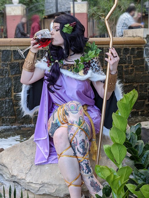 "That sound...That was...revelry? People having a good time? Well, sure, then! In the name of Hades! Olympus, I'll accept this message." 🥻: @RainbowRex 📸: @Maison_Hikari 🍷: @princeofdrunk 🎮: @SupergiantGames #dionysuscosplay #hadescosplay #cosplay #Hades #dionysus