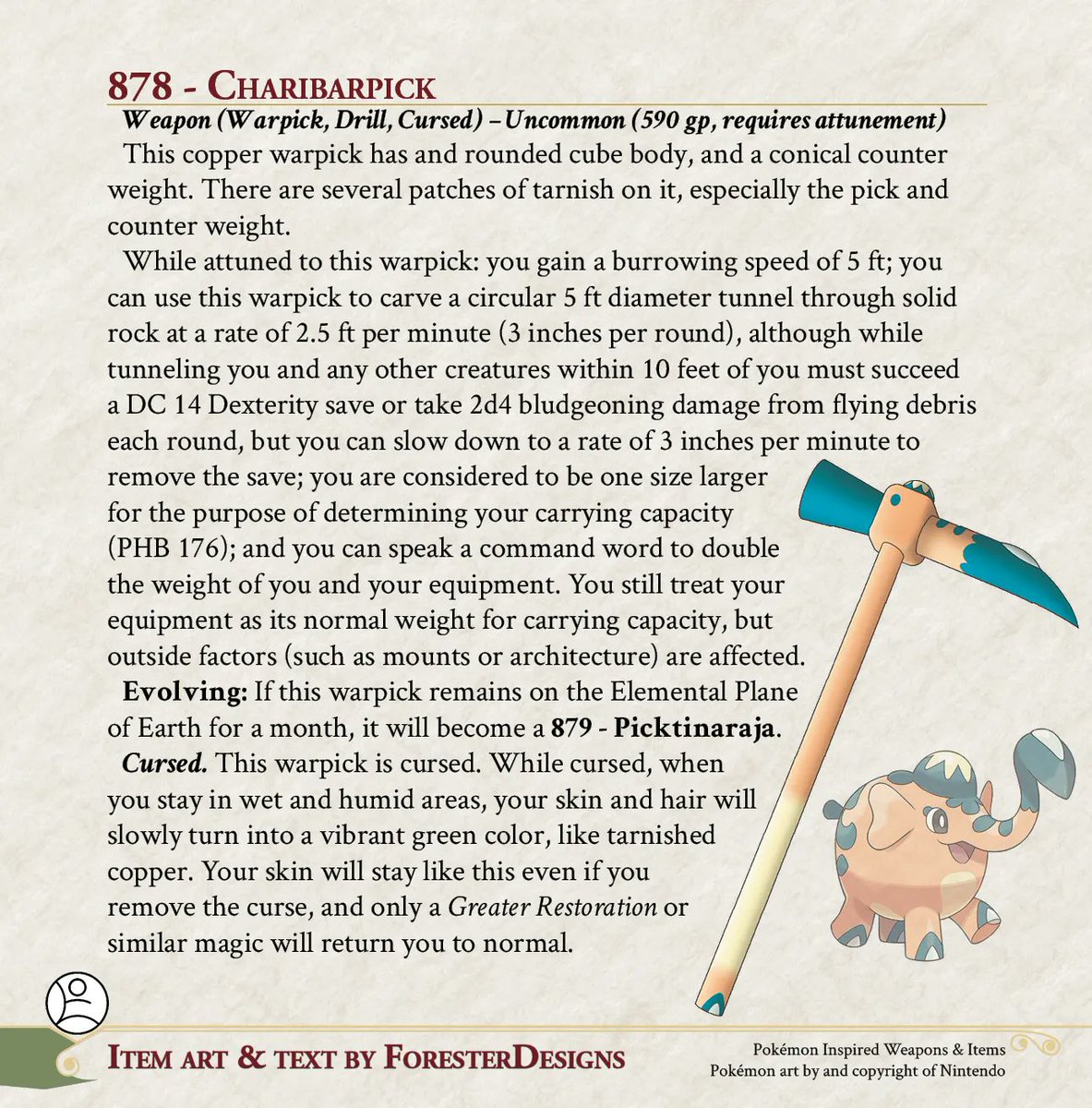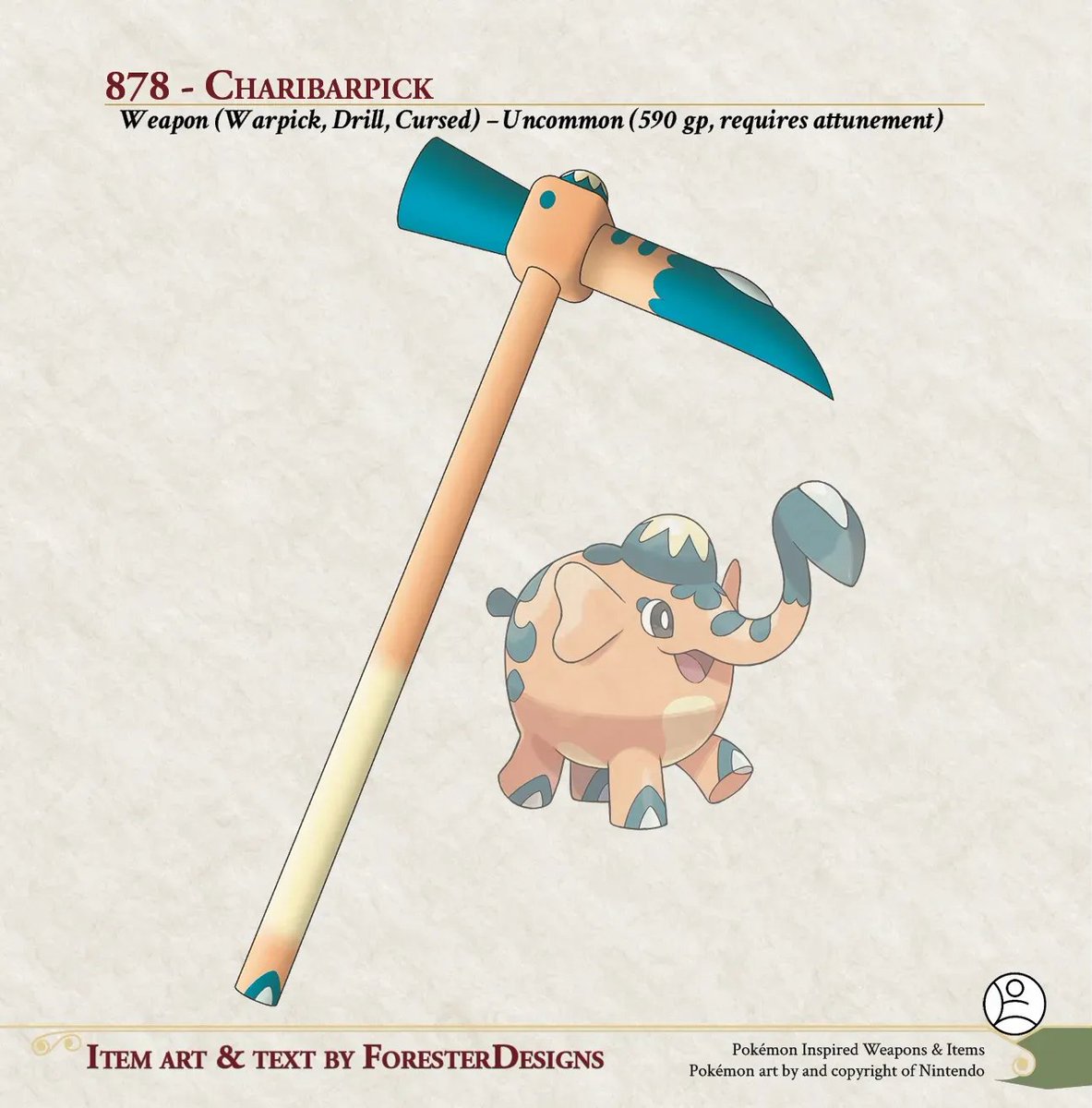 My #DnD #Pokemon #MagicItem of the Day, with a #Cufant #warpick to help you dig! Become a Patron to get the full collection and more at buff.ly/3afHNwh #DnD5e #DnDItems #DnDHomebrew #Nintendo #TTRPG #DnDArt #5e #DnDPokemon #5eItems #DungeonsAndDragons #DnDArtwork #Item