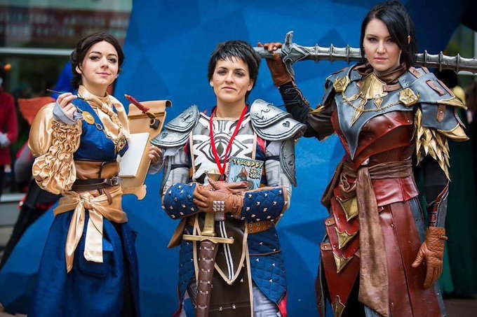 Throwback! @itsginnydi as Josephine Me as Cassandra Sarah Cain as the Inquisitor #dragonagecosplay In front of the big blue bear at Denver Comic Con 2015