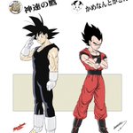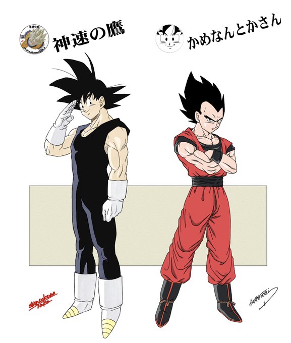 かめなんとかさん@kame_nantoka と、イラストのコラボをさせて頂きました😊 (無理やり付き合わせた(笑)) 自分が魔人ブウ編のベジータの服装の悟空を かめさんが、悟空の道着を着たベジータを😊 こういうのも楽しいですね〜😊 #dragonball #dragonballart #ドラゴンボールイラスト