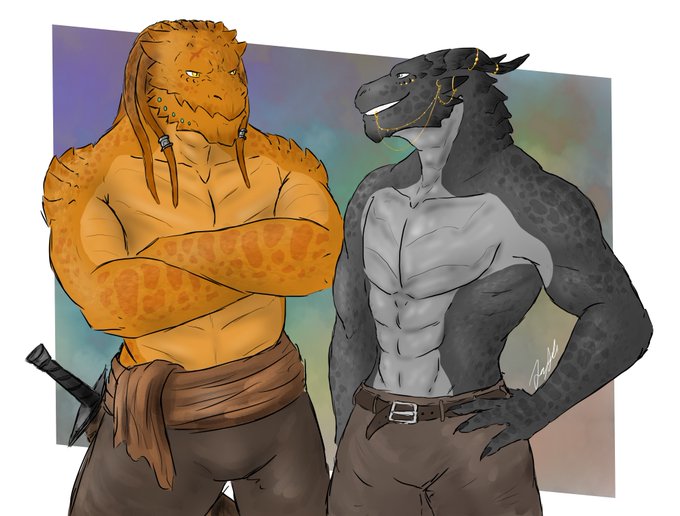 Syan and Rah'Ksen. Their personalities, their abilities, their strengths, their weaknesses are in complete opposition but here they are; together! #Lizardman #DragonBorn #dnd5e (BG are real photos. Shame on me!)