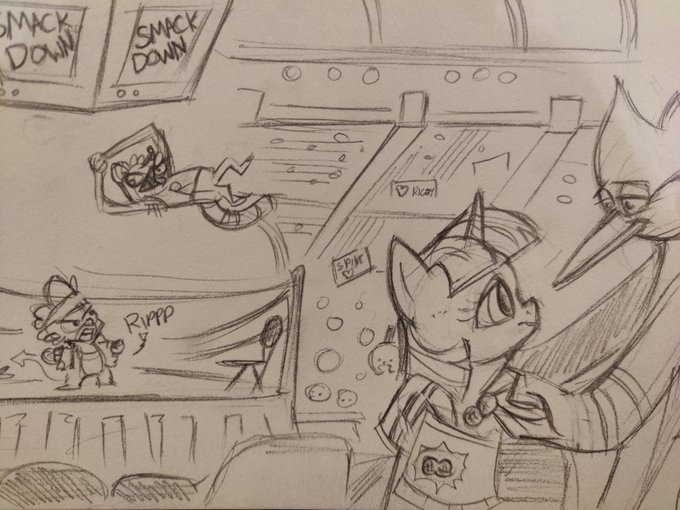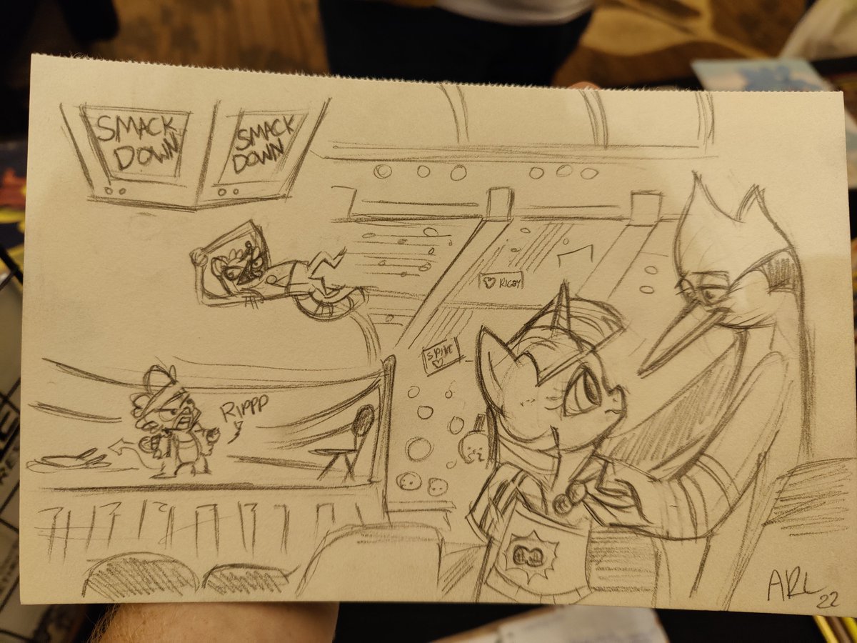 It's not a good #mlpfim convention without a couple of #mordetwi sketches! Check out these wacky #commissions from #efnw2022 The slime fight in the sewers is my favorite 😂 #mlpfanart #TwilightPrincess #RegularShow #dating #brony #commissions #sketch