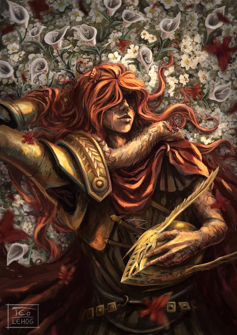Malenia, Floral rest 🦋 #ELDEN_RING #fanart Big illustration today, I wanted to paint Malenia 💛 in a more peacefully mood than usually and tried to keep the the feel of strength of this character. RT truly appreciate for this big illustration ✨🖤✨