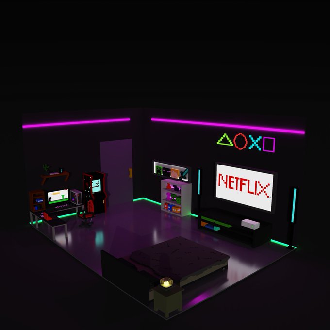" GAMING ROOM " Gaming room with beautiful lighting that is a beautiful picture of a great lighting that is depicted. PRICE: 0.4 LINK: exchange.art/single/AZpb57n… #NFTSPACESHIP #solana #exchangeart #voxel #voxelart #voxelartist #wili_nfts