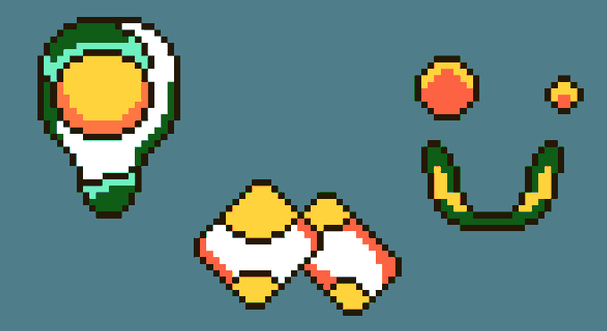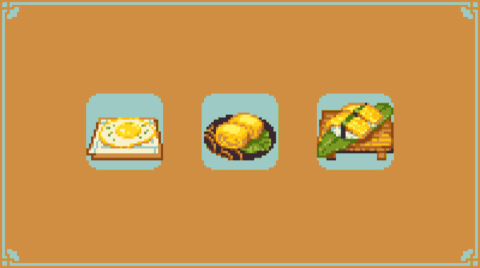 A #set of 32x32px #EggRecipes from #GenshinImpact for @Pixel_Dailies !! Teyvat Fried Egg - Egg Roll - Bird Egg Sushi #pixel_dailies #ドット絵 #pixelart #aseprite #原神