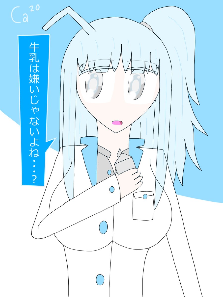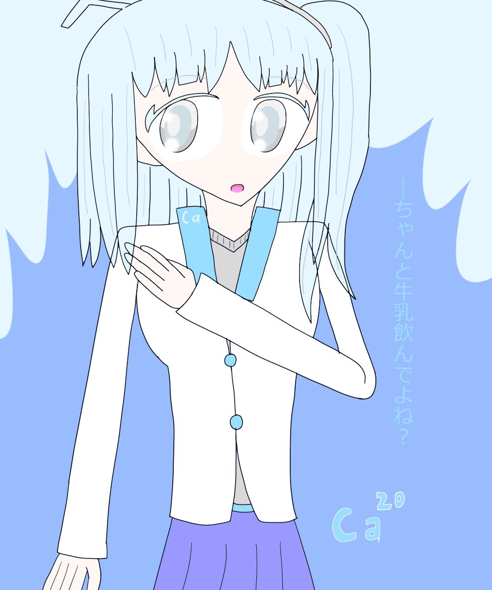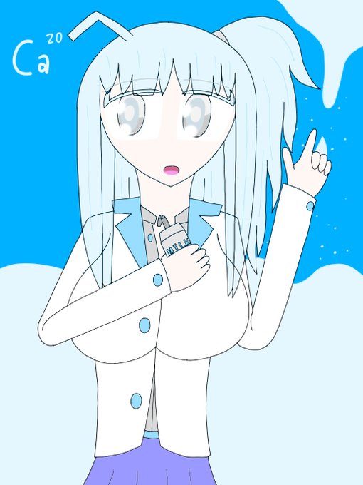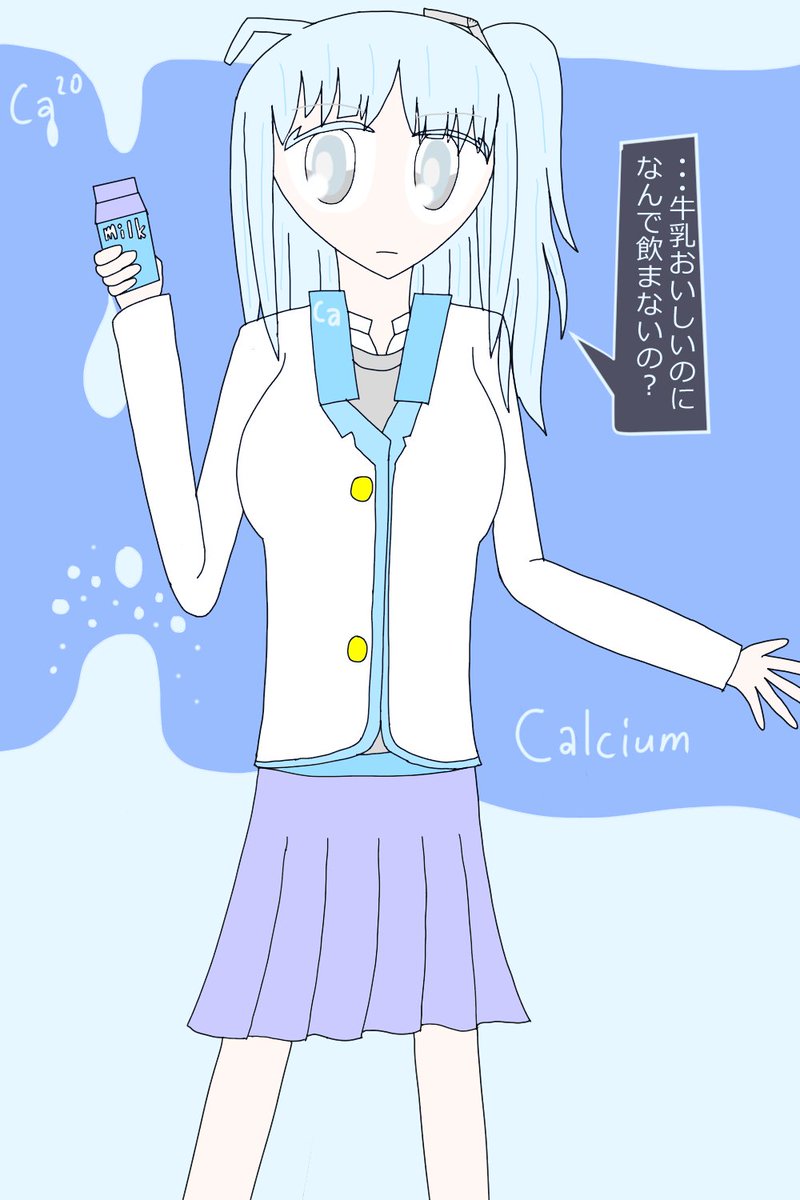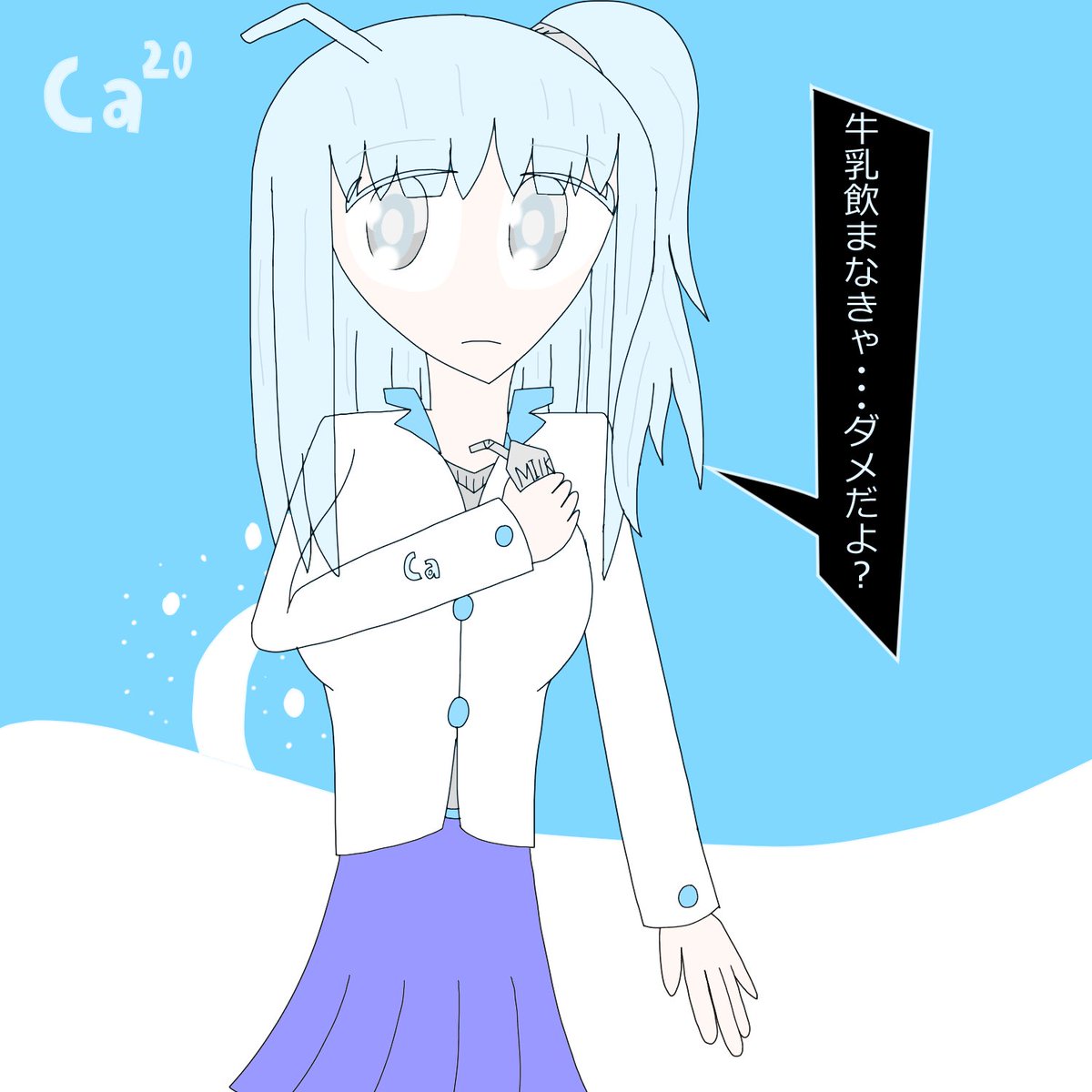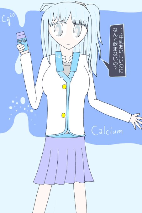 1.カルシウム 牛乳に対しての愛が重いメンヘラ女子 とにかく牛乳を飲むことを強要する、牛乳嫌いな人に対してこれでもかと牛乳を飲ませに来る、などとにかく牛乳好き 実はチョークも食べれたりする(本人曰く「粉っぽい」) #イラスト #元素擬人化 #ElementsLife