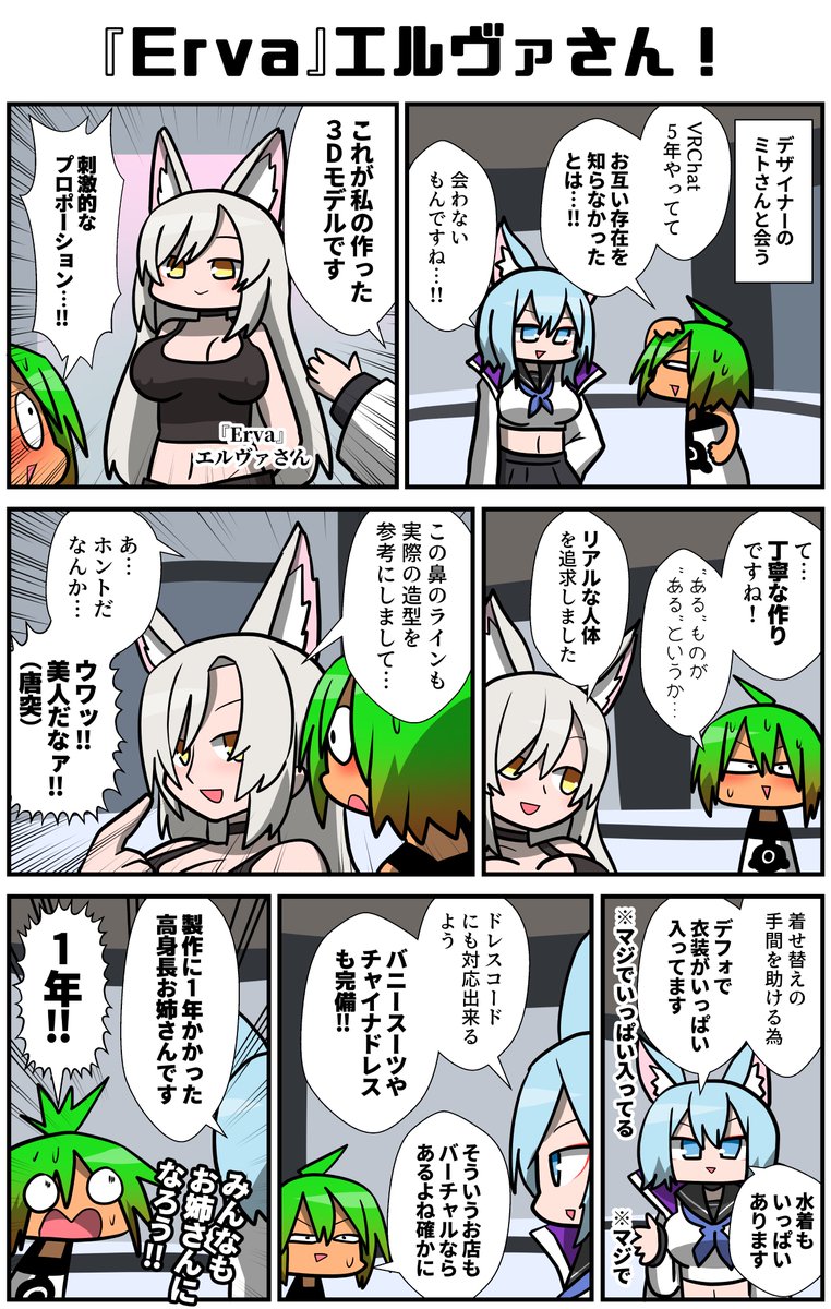 リアルな人体を追求したというミトさん(@mito3dcg)製作の高身長お姉さんアバター「Erva」エルヴァさんを見てきた!元から色んな種類の衣装が内蔵されているのは、改変の時間を節約したい現代人にとって嬉しい!丁寧に作られているな~…!! #VRC漫画 #VRChat #ad #ErvaMedic #AtelierMito