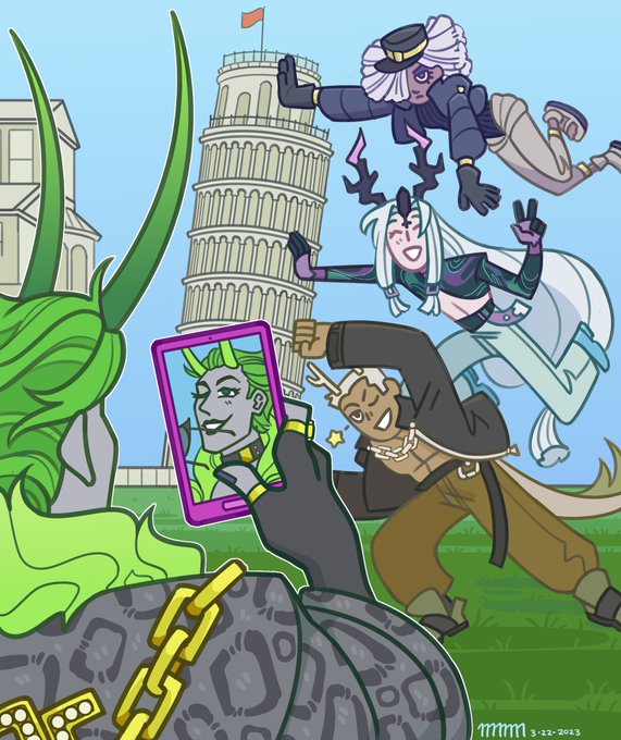 Berenice visit Italy's famous Leaning Tower of Pisa! Later that night, she visits a pizzeria to get a delicious little conveniently named snack. I hope you enjoy the little references that drawn of other espers around the canvas!! #Dislyte #dislytefanart #EspersHTR #Berenice