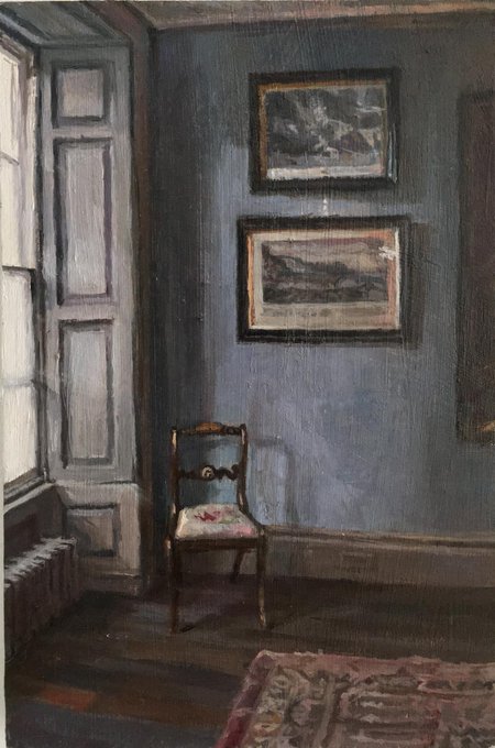 Blue Room. Oil on panel. 33 x 26cms. bit.ly/3tg7S4K #oilpainting #interiors #art #artist #exhibition