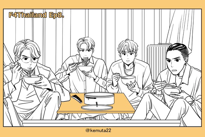 これは描かずにはいられなかった可愛い大賞!!!食べる前は文句言ってたのに一転夢中になってテレビ見ながらラーメン食べてるF4がめちゃくちゃ可愛かった😆💕💕いつもクールなRenが思いっきり頬ばってるのも最高すぎたー💕💕 #F4ThailandEP8 #F4Thailand #F4ThailandFANART