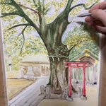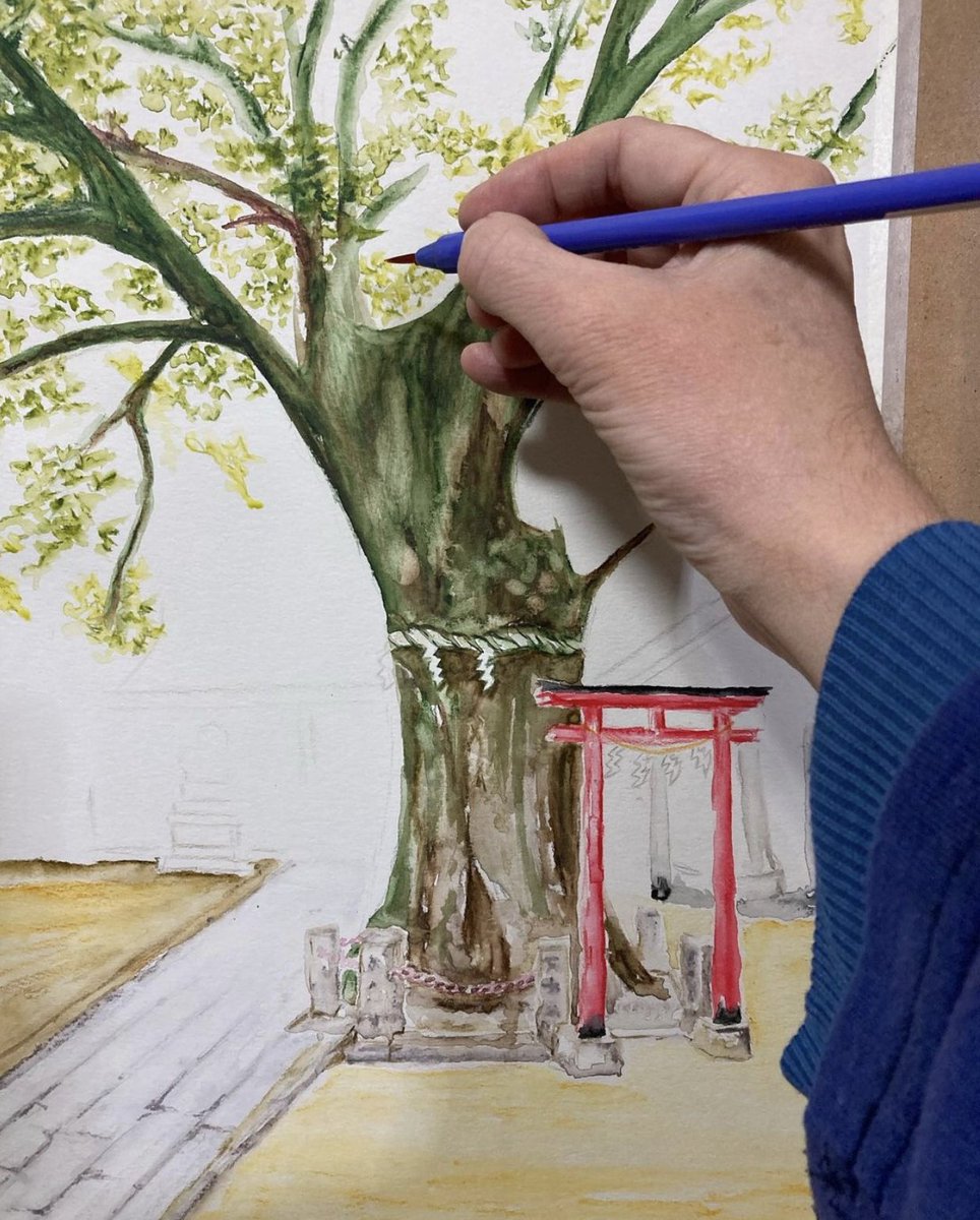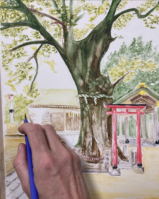 Started to add leaves to the zelkova tree in front of the Nitta Shrine #WIP #WorkInProgress #Painting #Watercolour #Watercolor #WatercolourPencils #FaberCastell #ArtistsOnTwitter