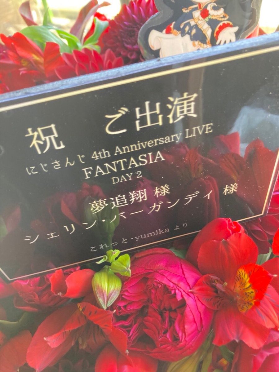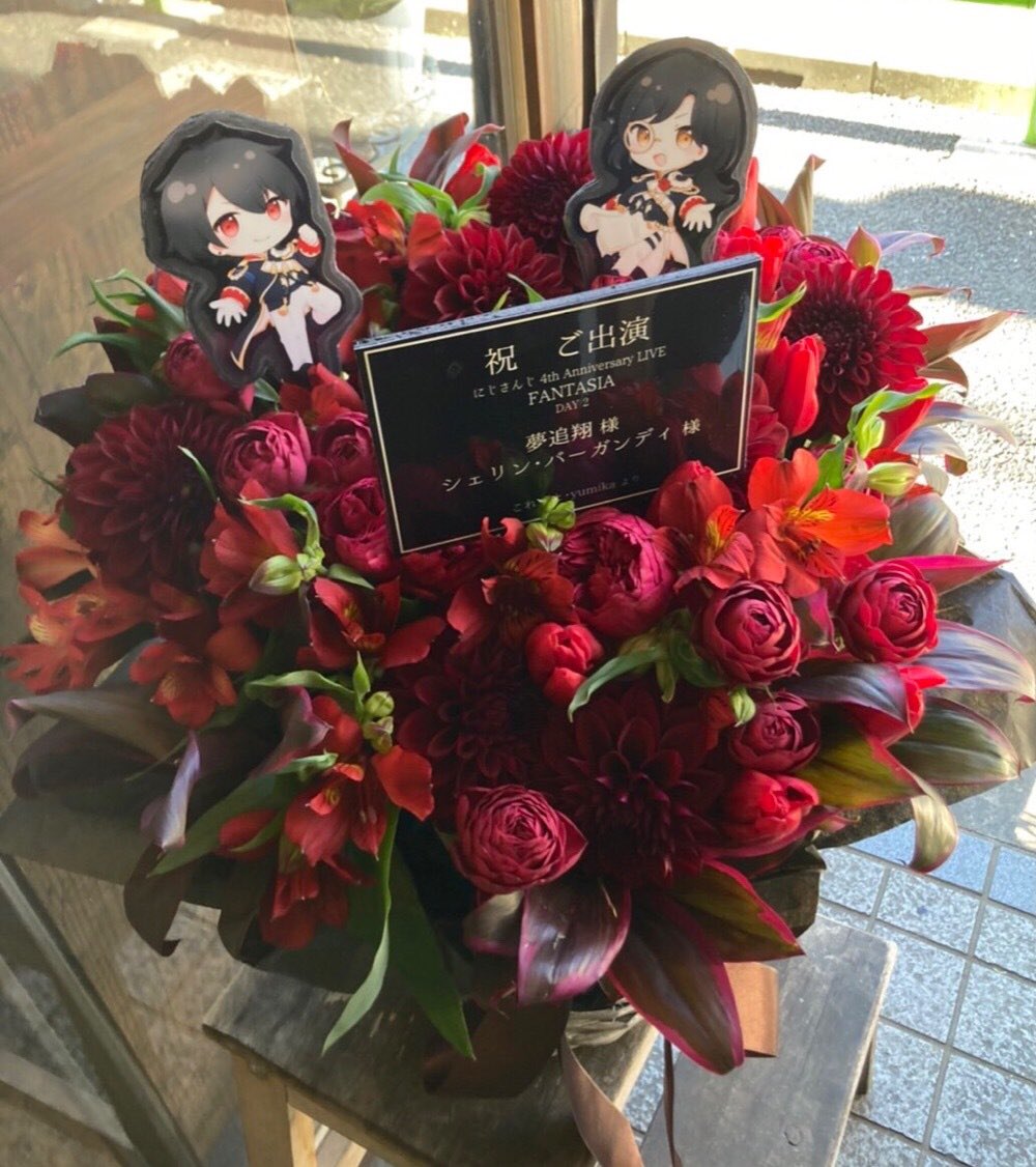 「にじさんじ 4th Anniversary LIVE 『FANTASIA』Day2」にて、coretto(@Coretto_coto)と連名で、夢追翔様・シェリン・バーガンディ様宛に贈る予定だった楽屋花です🌹 いつかまたステージに立つお2人の姿を拝見できますように! #FANTASIA #FANTASIA祝い花 #fantasia_day2 #絵かける #シェリンの証拠品