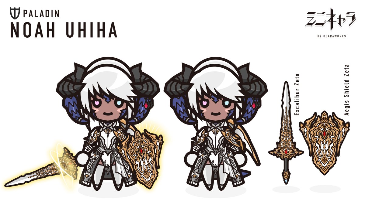 ミニキャラNo219 ノア殿さん(@noahdono54) アウラさんにデモンホーンの ダブルホーン✨ エクスカリバー、イージスの盾! めちゃかっこいい聖騎士様✨ #osaraworks #FF14 #FF14ミニキャラ #FF14イラスト #FFXIVART