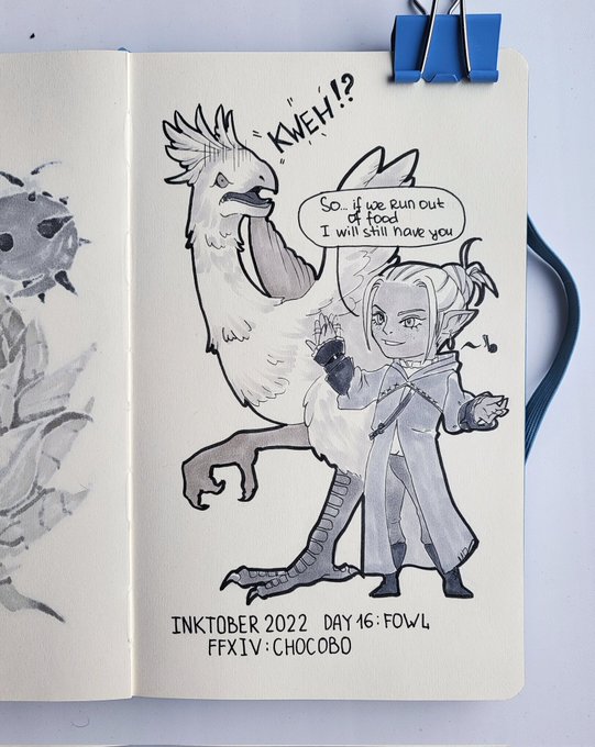 DAY 16: Fowl [Dark elezen isn't my XD His nane us Sarfein] #art #traditionalart #penandpaper #ffxivfanart #ffxivart #inktober2022 #inktober #ffxivinktober #ffxivtober #chocobo #elezen