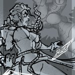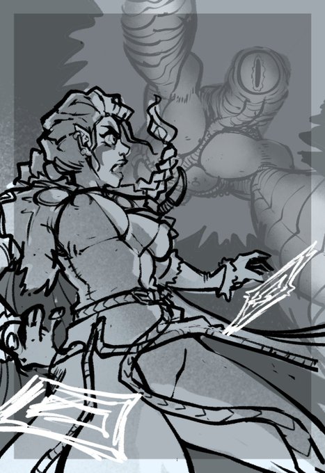 Initial sketch for @RenieDraws #FIENDISH2FANART contest! I think the monster is probably going to be redesigned several times... (Thank you for including a very convenient loose belt strap in Ragna's design 🤘) #illustration #sketch #fanart #fantasyart #comic #manga #wip