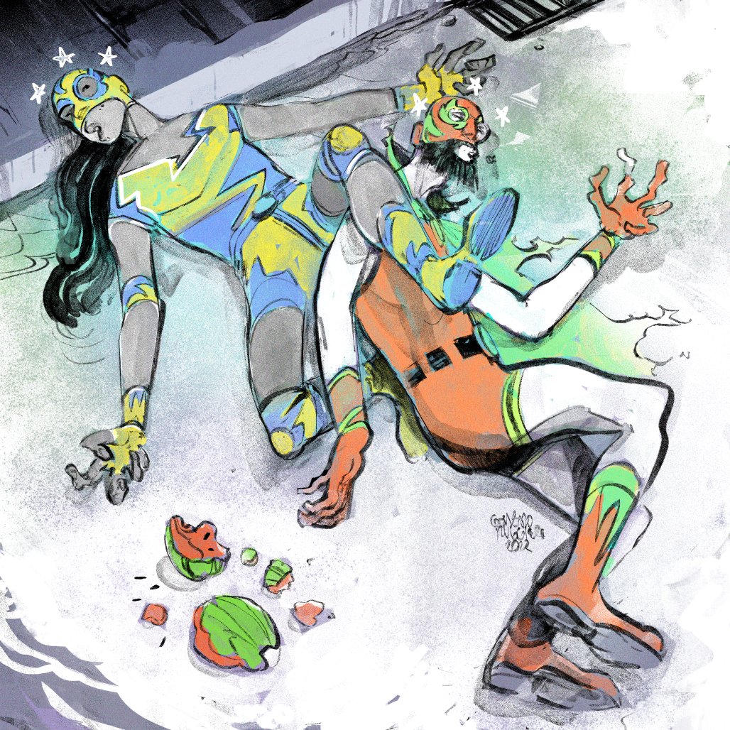 A drawing for the podcast TwoWatermelonsinaSack #drawing #illustration #podcast #art #artist #pinup #fight #wrestling