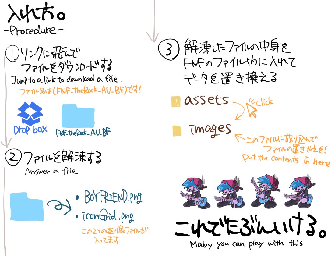#FNF_theRock_AU Rock BFのスキン作ったのでよかったら以下のURLに飛んでファイルをダウンロードして遊んでみてください! week4とweek5のスキンは作ってないのでそれ以外で楽しんで…ね… クソほどわかりずらい入れ方も添えておきます…💥 ↓↓↓↓ dropbox.com/sh/68zyiykybty…