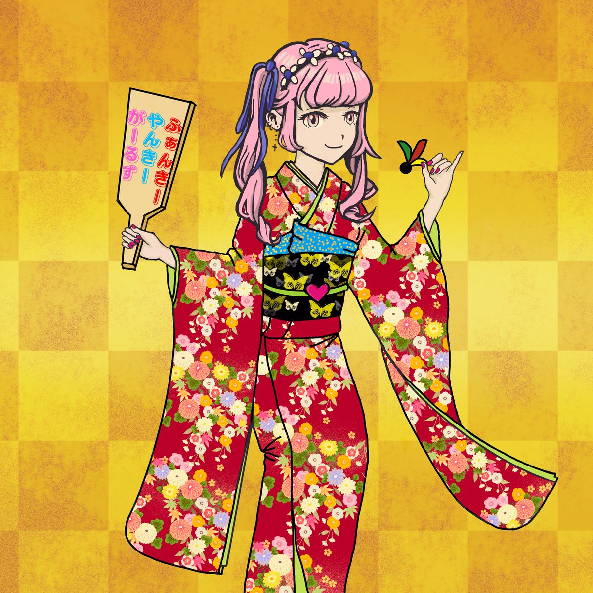 🎍ANISUファンアートコンテスト🎍 お正月なので晴れ着でおめかししたFYGちゃん💕 金屏風の前で、はい!ポーズ📸 私の母(70代)がiPadで描きました🎨 使用ソフトはプロクリエイトとアイビスペイント✨ @ANISU_NFT @FYG_project #ANISUファンアート #FYG