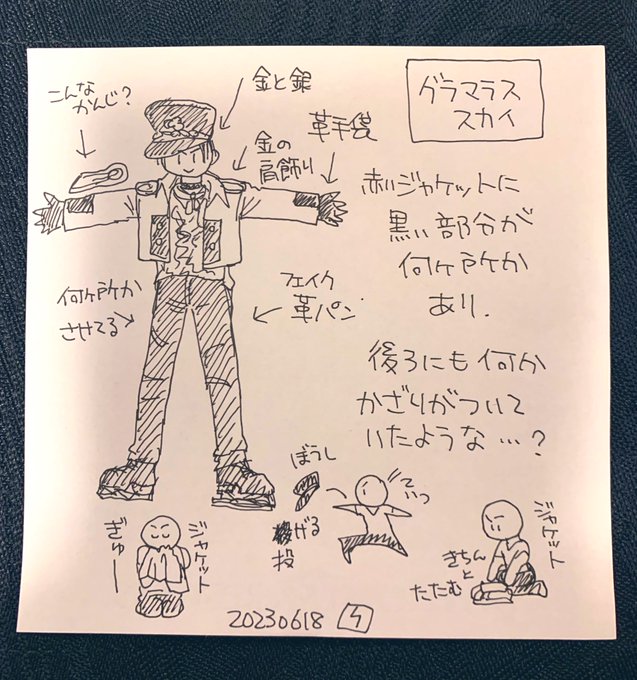 無理ダメだ私の海馬仕事しなかったあんなにガン見したはずなのにGLAMOROUS SKYの赤ジャケットの襟のかたち思い出せない😭 (ホテルのメモ帳に落書きクオリティお許しください🙇♀️) #FaOI2023新潟 #羽生結弦