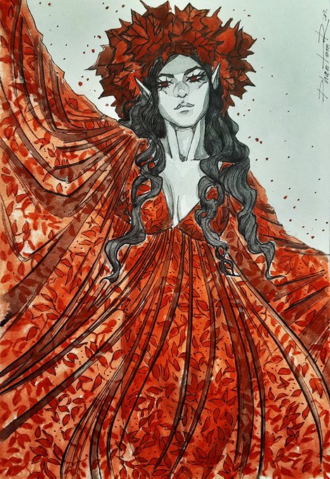Inktober. Day 28 - Autumn. #Inktober #inktober2022 #autumn #Faerie #lady #red #art #illustration #traditionalart #PhantomRin