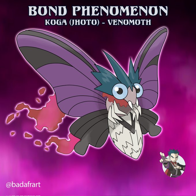 Meet Koga's Venomoth of Elite4! After using Sleep powder, it strengthens the Pokémon's bond with its Trainer, and it becomes Koga-Venomoth. Bug-type moves change into poison-type moves. #bondphenomenon #venomoth #fakemon #fakemonart #kensugimoriart #kensugimori #pokemonfanart